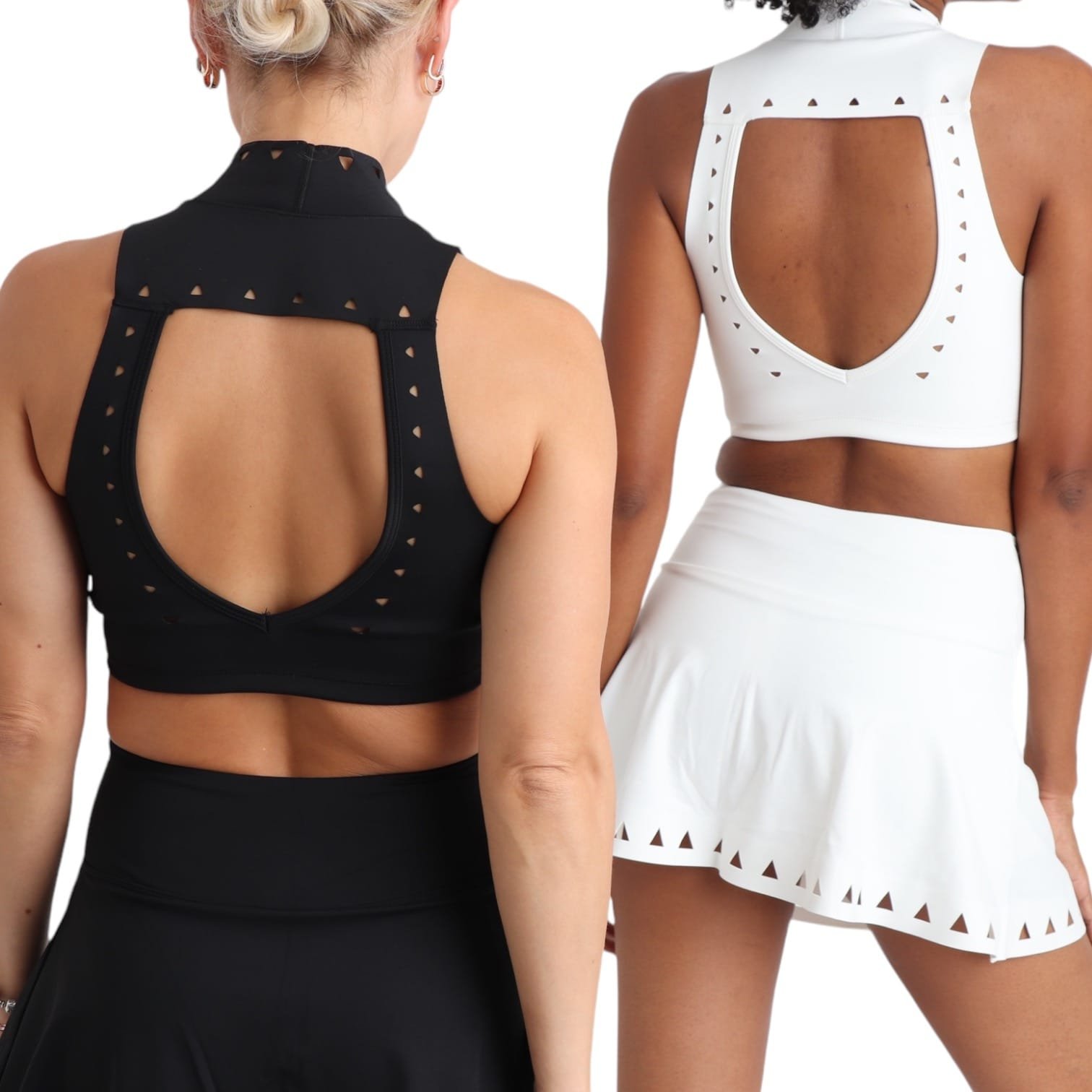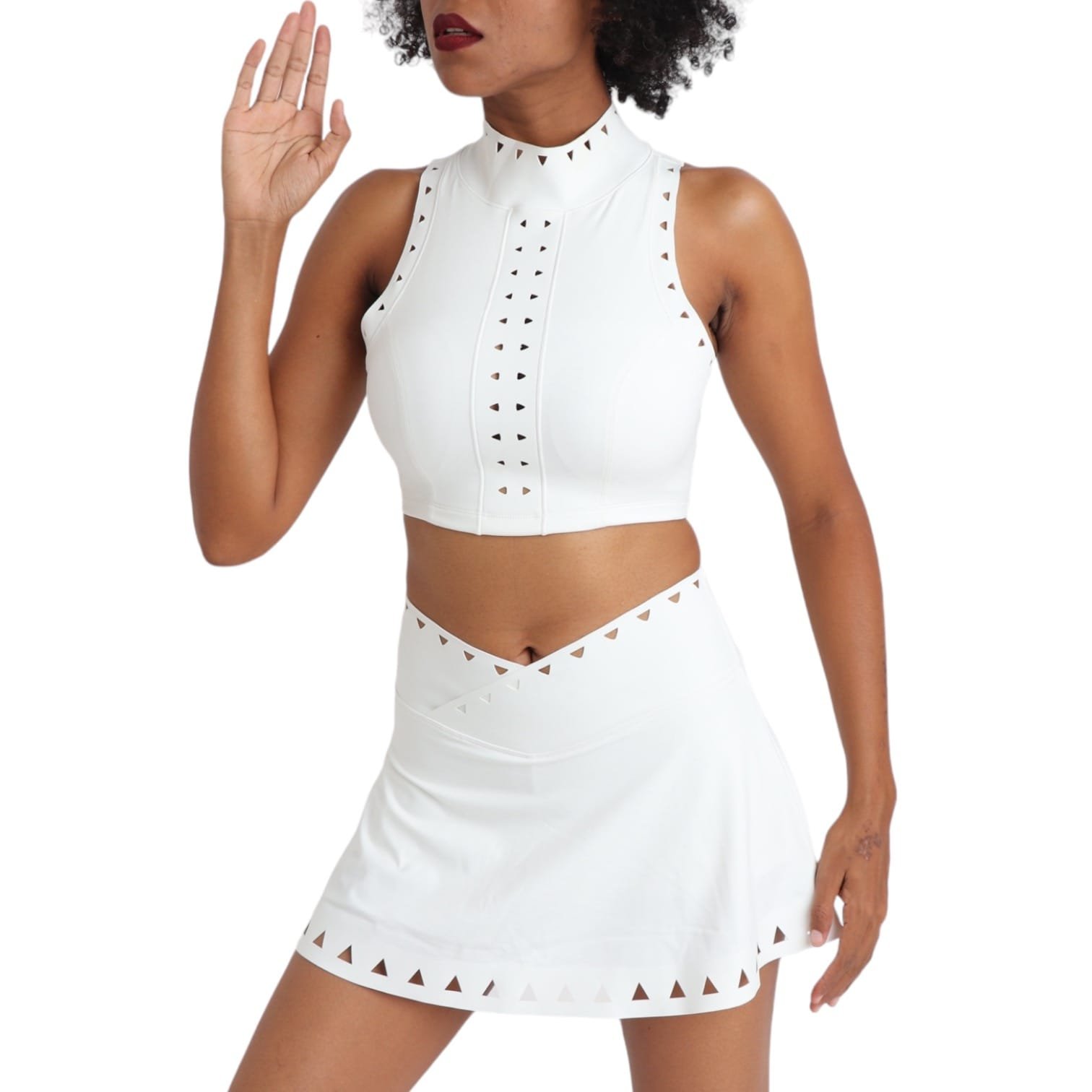 El Set Océano combina estilo y funcionalidad en un diseño sofisticado, sus detalles de cortes geométricos añaden un toque moderno y atrevido. El Top de cuello alto y espalda con escote en “V” brinda ventilación y un toque moderno. El diseño de cintura alta y cruzada al frente de la falda favorece la figura. Este set es perfecto para actividades ligeras, deportes de pelota y para crear looks casuales para el dia a dia.