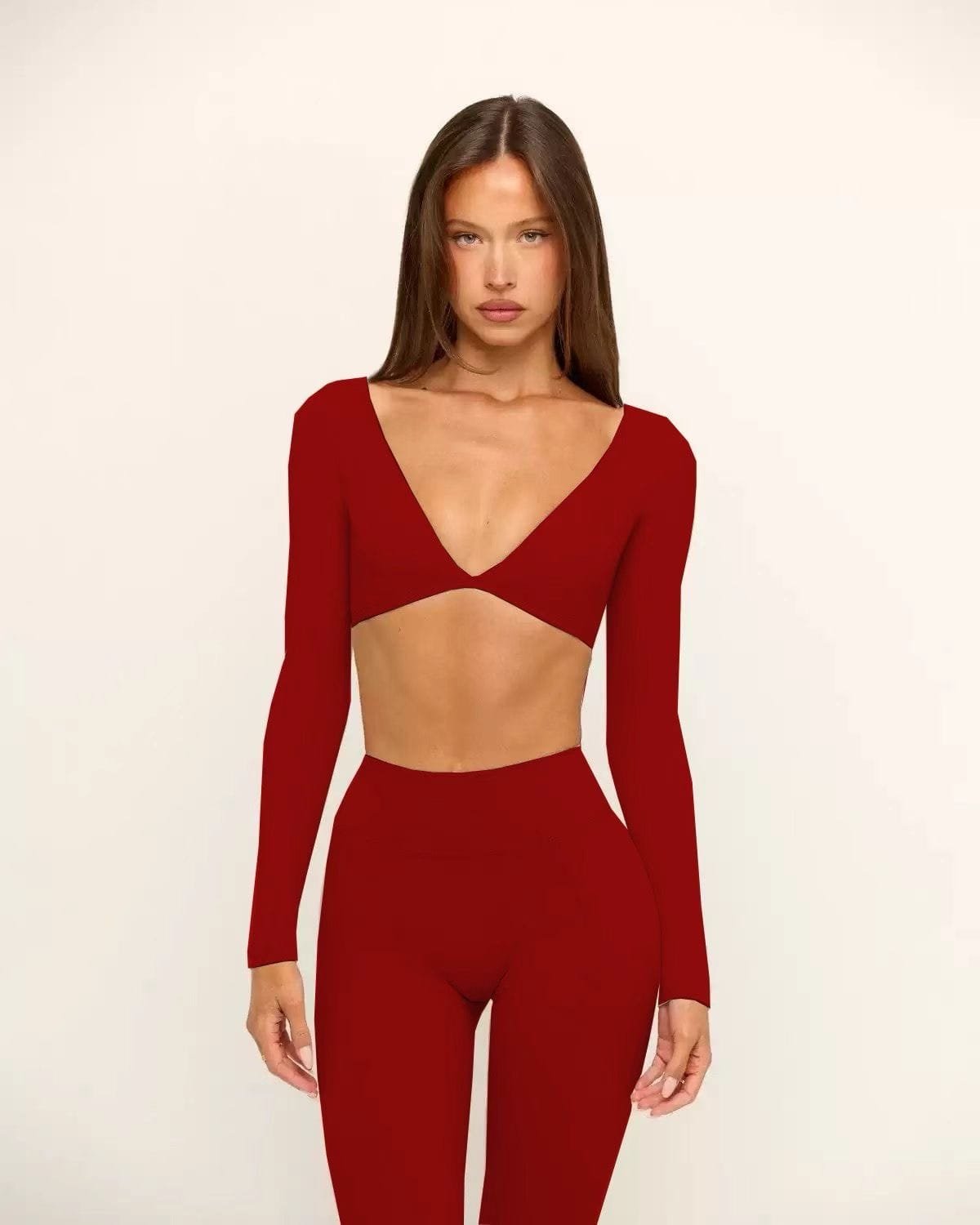 El Set Tempestad combina el top de manga larga con escote profundo en V y copas removibles, junto con el legging de cintura extra alta —el más alto de la colección hasta ahora— diseñado para brindar máxima seguridad y definición.